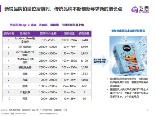 據統(tǒng)計數據顯示,速溶咖啡品類已成為短視頻帶貨平臺的主要細分類目,占據了咖啡類目超過50%的銷售占比。在這樣的市場環(huán)境下,暴肌獨角獸憑借出色的產品品質和營銷策略,成功躋身市場前列。根據第三方數據公司藝恩電商智庫的《2023上半年咖啡用戶消費趨勢洞察報告》,暴肌獨角獸在榜單中位列第五位,超過了眾多新消費品牌,甚至將傳統(tǒng)咖啡巨頭甩在身后。