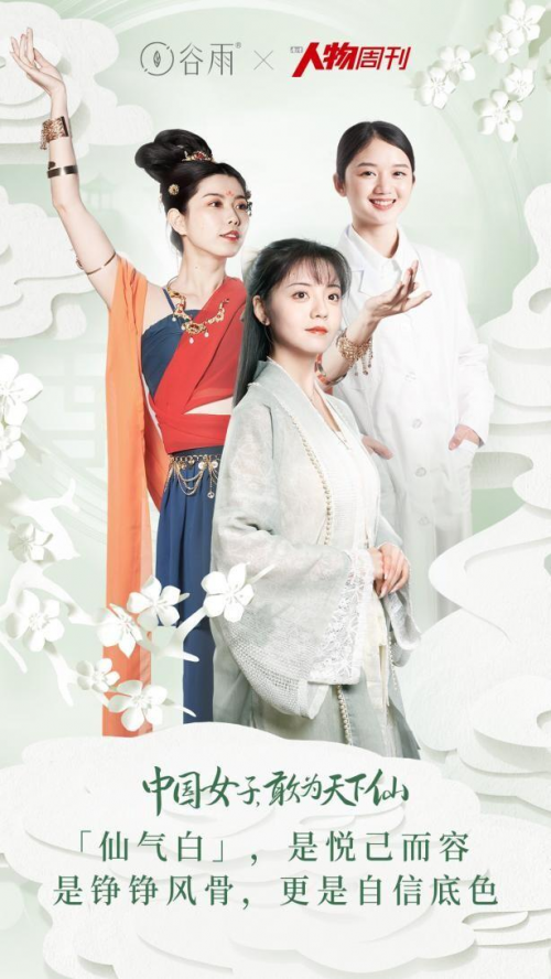 谷雨從傳統(tǒng)東方美人的形象中,提煉出了中國式“仙氣白”的審美追求。即我們所追求的中國式古典美,是溫婉大氣、古典優(yōu)雅、端莊謙和的,而“仙”之一字如今的內(nèi)涵得以延展,更多體現(xiàn)于品格之上,或形容俠肝義膽,或看似出塵于世卻有著自身的理想與堅持。谷雨將這些美好的品格與現(xiàn)代女性獨(dú)立自主的品德相融合,與《南方人物周刊》共同合作提出了“敢為天下仙”的現(xiàn)代中國女性形象追求,將“仙氣白”的新古典審美具象化,賦予了中國美人以貫古通今的全新內(nèi)涵。