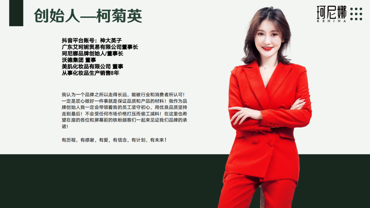 珂尼娜品牌做優(yōu)質(zhì)護(hù)膚品的同時(shí)更是重視社會(huì)責(zé)任,參與社會(huì)的公益事業(yè),切實(shí)的做到了當(dāng)代國(guó)民品牌的表率。創(chuàng)始人柯菊英經(jīng)常通過(guò)其抖音賬號(hào):神大英子,向大家普及護(hù)膚知識(shí),同時(shí)也會(huì)分享作為年輕企業(yè)家的創(chuàng)業(yè)理念和經(jīng)驗(yàn),去幫助更多的人。