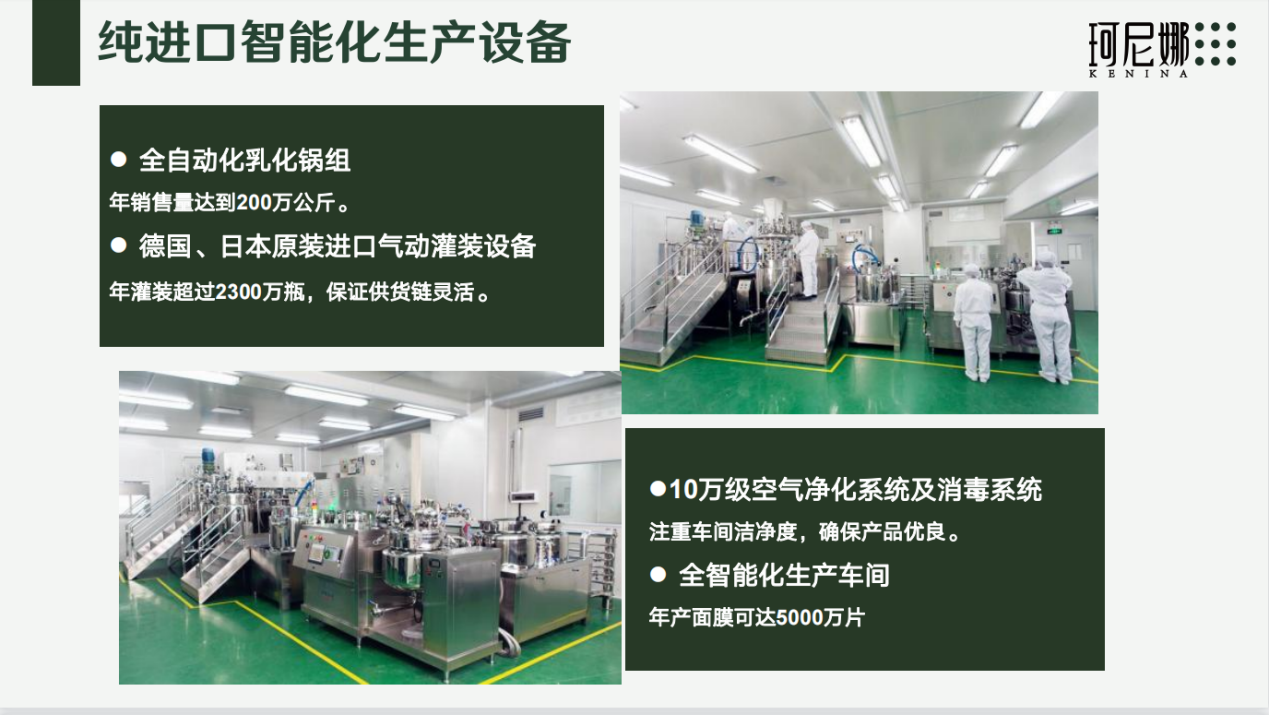 珂尼娜品牌隸屬于廣東艾珂妮貿(mào)易有限公司,其成立于2012年,廣東艾珂妮貿(mào)易有限公司旗下?lián)碛型晟频脑O(shè)計(jì)開(kāi)發(fā)實(shí)驗(yàn)人員和多項(xiàng)護(hù)膚品專利開(kāi)發(fā)技術(shù),產(chǎn)品獲得質(zhì)量管理體系雙國(guó)際認(rèn)證。珂尼娜旗下的生產(chǎn)車間是一家專業(yè)從事化妝品與日化用品 研發(fā)、生產(chǎn)、銷售、特殊皮膚修護(hù)產(chǎn)品定制和售后服務(wù)為一體的高新科技企業(yè),公司 榮獲歐盟ISO9001、ISO14001雙國(guó)際良好認(rèn)證以及美國(guó)FDA認(rèn)證。致力于研發(fā)生產(chǎn)全 球領(lǐng)先科技,天然無(wú)添加、健康安全的護(hù)膚、彩妝、個(gè)護(hù),大健康的“妝”、“消”字號(hào)類 等高端產(chǎn)品。廠區(qū)總面積達(dá)20000平,擁有10萬(wàn)級(jí)的生產(chǎn)車間,數(shù)十條全自動(dòng)化生產(chǎn)線,6000多款成熟配方,打造全線類的智能制造企業(yè)。
