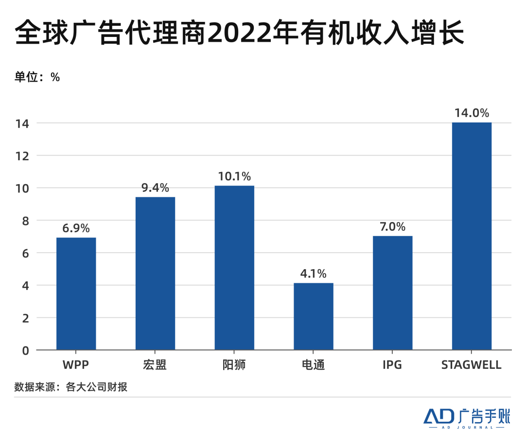 2022年,幾乎所有全球廣告控股集團的營收都在增長。其中,陽獅集團的有機收入同比增長10%;即便增長勢頭在同行中稍弱,日本電通的增速也達到4%。