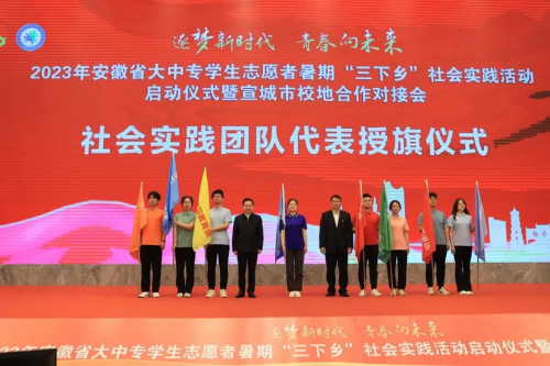 活動現(xiàn)場,宣城市委書 記李中,團(tuán)省委書 記陳明生,省文明辦副主任王芳,省教育廳思政處處長王后林,宣城市委常委、組織部長朱立軍,宣城市政府副市長汪侃,省委宣傳部宣傳教育處三級調(diào)研員朱珠等共同啟動2023年安徽省大中專學(xué)生志愿者暑期“三下鄉(xiāng)”社會實踐活動,并向暑期“三下鄉(xiāng)”社會實踐團(tuán)隊代表授旗。
