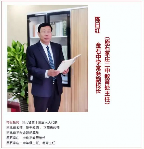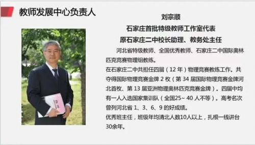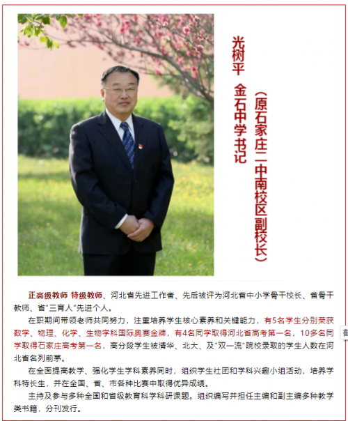 石家莊金石中學書 記光樹平為原二中南校區(qū)副校長,該校常務副校長為原二中教育處主任陳日紅,及石家莊首批特級教師工作室代表為原石家莊二中校長助理劉宗順,所教班級年均清北人數(shù)10人以上,學校復讀部每一位老師都有多年帶高三畢業(yè)班經驗,管理團隊主要領 導的平均管理年限27年,學科帶頭人或備課組長平均教齡20年。特級教師3人,高級教師占比25%,985、211、雙一流院校及研究生占比40%以上。