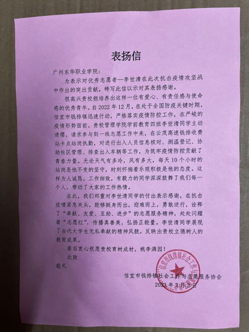 “盡可能去做一些有意義的事情?!彼沁@樣想的,也是這樣做的。他不怕苦不怕累,在疫情防控工作中表現(xiàn)突出,展示著新時代青年志愿者的責(zé)任與擔(dān)當(dāng),獲得廣東共青團頒發(fā)的“志愿防疫貢獻徽章”和當(dāng)?shù)孛裾块T的表揚信。