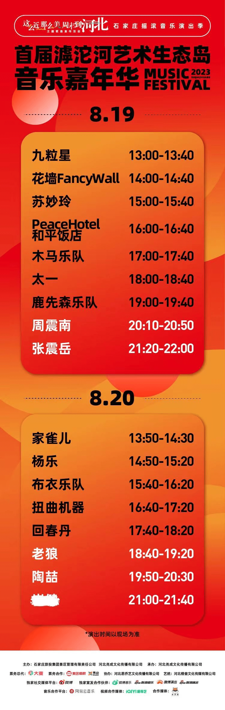 此次音樂嘉年華演出時間為: 8月19日、20日(周末兩天),地點位于石家莊滹沱河藝術生態(tài)島。8月4號(周五)上午10點,預售正式開啟。8月6日(周日)上午10點,音樂嘉年華正式開票!