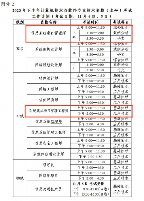 根據(jù)軟考辦發(fā)布的《關(guān)于2023年度計(jì)算機(jī)技術(shù)與軟件專業(yè)技術(shù)資格(水平)考試工作計(jì)劃及有關(guān)事項(xiàng)的通知》可以得知,2023年下半年軟考考試時(shí)間為11月4、5日,具體如下表所示: