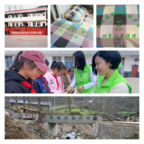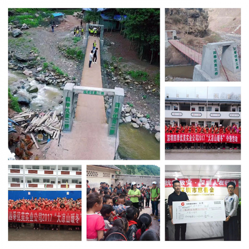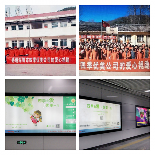 賑災捐款,參與健康類公益救助項目,捐建校舍、橋梁,改造校園設施等,檢驗著四季優(yōu)美投身公益活動的成色。深圳關愛行動“十佳愛心企業(yè)”提名獎的殊榮,是對四季優(yōu)美長期堅持公益的肯定。而逐年推進的“暖冬”活動及“一加一”資助行動,更已成為具有四季優(yōu)美文化內(nèi)涵的公益品牌。