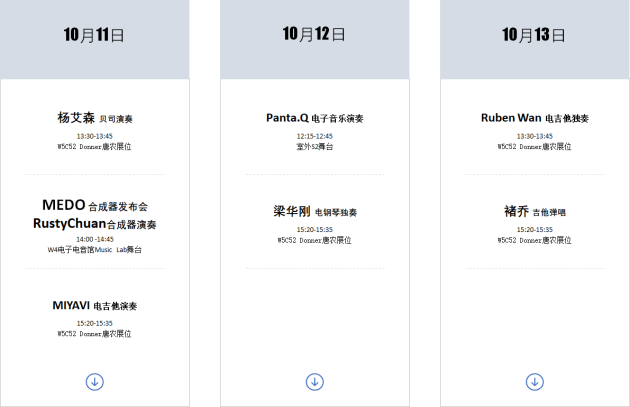 在展會首日,即10月11日星期三,與會者可以前往W4 電子電音館的Music Lab舞臺觀看來自RustyChuan的合成器演奏;在Donner唐農(nóng)主展位W5C52,日本吉他演奏家MIYAVI將使用唐農(nóng)Donner Arena2000綜合效果器展示其極具特色的slap風(fēng)格吉他技法。來自中國臺灣的知名貝司演奏家楊艾森也將會在展會首日于Donner 唐農(nóng)展位進(jìn)行貝司演奏和產(chǎn)品試用。