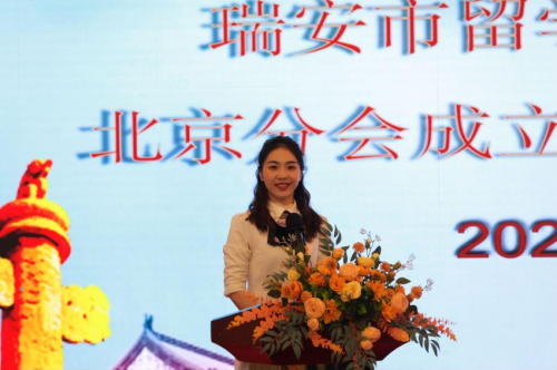 新當選的瑞安市留學人員和家屬聯(lián)誼會北京分會第 一屆理事會洪曉瑩會長代表理事會發(fā)言。