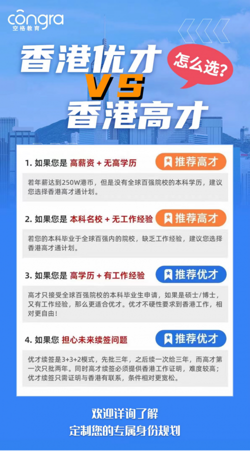 今天空格教育跟大家來探討一下這個(gè)話題,看看香港優(yōu)才計(jì)劃和高才通哪個(gè)更適合你?