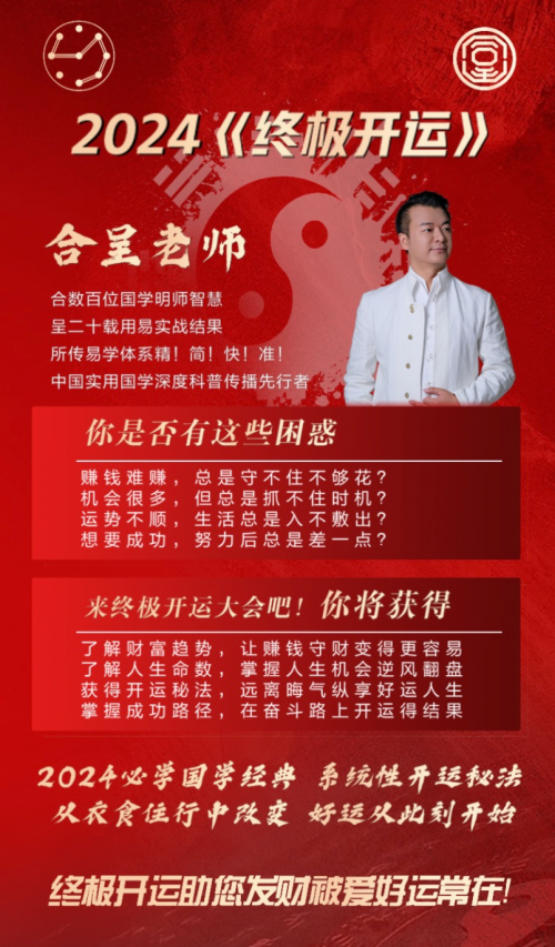 新年新氣象,2024年想要鴻運(yùn)當(dāng)頭,萬事順?biāo)?,不妨從深入了解?guó)學(xué)開始,從鉆研《易經(jīng)》開始,從“終極開運(yùn)”系列課程開始。讓我們?cè)谥髦v老師——合呈老師的帶領(lǐng)下,了解傳統(tǒng)文化,取其精華,去其糟粕,化繁為簡(jiǎn),推陳出新,用現(xiàn)代科學(xué)思維,實(shí)現(xiàn)個(gè)人更好的發(fā)展。