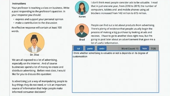 最后再來看看寫作部分。托福的“獨立寫作”部分在改革后變成了“學(xué)術(shù)討論寫作”,要求考生針對指定話題闡述觀點并提供論據(jù),該有的學(xué)術(shù)能力依舊不可缺少。同時,這一部分還會涉及聽力和閱讀能力考查,對考生的綜合能力要求較高。相較之下,雅思略容易一些,只要抓住題干信息,觀點明確不跑題,基本上不會出現(xiàn)大問題。