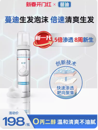 在消費(fèi)者頗為關(guān)心的產(chǎn)品價(jià)格方面,“蔓迪泡沫劑”的活動(dòng)價(jià)為198元/瓶,規(guī)格為60g/瓶,產(chǎn)品批準(zhǔn)文號(hào):國(guó)藥準(zhǔn)字H20234731。作為一款全新升級(jí)的生發(fā)類(lèi)產(chǎn)品,該產(chǎn)品的定價(jià)也頗具市場(chǎng)競(jìng)爭(zhēng)力,讓更多消費(fèi)者用合理的價(jià)格享受到更好的產(chǎn)品。