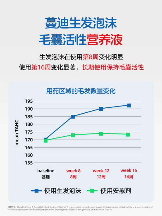 優(yōu)勢(shì)三:準(zhǔn)確給藥。傳統(tǒng)的溶液劑易揮發(fā),擦在頭皮上易析出結(jié)晶,影響藥物吸收。蔓迪泡沫劑中米諾地爾穩(wěn)定性更高,且具有不易揮發(fā)的特點(diǎn),可以幫助提升藥物使用效果,并做到準(zhǔn)確給藥。