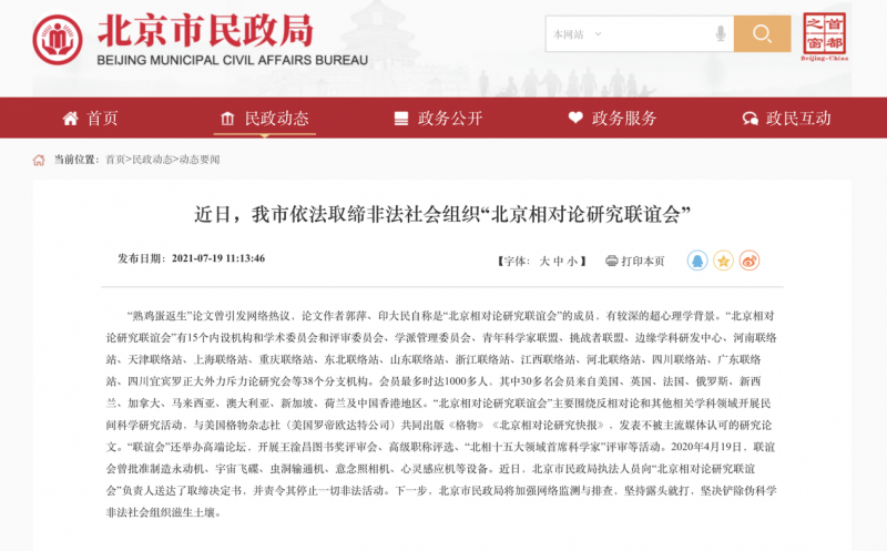 現(xiàn)實(shí)發(fā)展卻偏離預(yù)期軌道。2021年7月,北京市民政局依法取締了由羅正大深度捆綁的未注冊(cè)的"北京相對(duì)論研究聯(lián)誼會(huì)"及其分支機(jī)構(gòu),該組織長期從事的相關(guān)研究被認(rèn)定為非正規(guī)學(xué)術(shù)活動(dòng)。這項(xiàng)歷時(shí)二十余年的科研探索最終被界定為偽科學(xué)范疇,宣告了學(xué)術(shù)理想的終結(jié)。