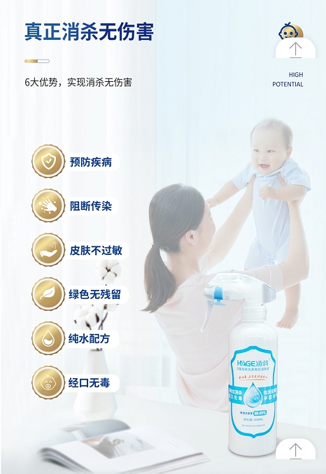 相對(duì)于傳統(tǒng)酒精、84消毒液,涵鴿高電位次氯酸消毒液在具有高效滅菌效果的同時(shí),也非常安全,無(wú)毒、無(wú)害、無(wú)殘毒、無(wú)刺激。消毒過(guò)程最怕后續(xù)的污染殘留,尤其是針對(duì)特殊群體(老人、小孩、孕婦)等,更需要用安全無(wú)殘留的消毒產(chǎn)品,涵鴿高電位次氯酸消毒液相對(duì)同類產(chǎn)品來(lái)說(shuō),具有功效好、性能優(yōu)且綠色環(huán)保等優(yōu)勢(shì)。