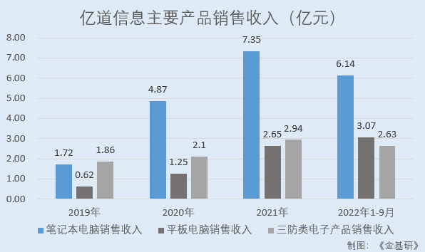 其中,2019-2021年及2022年1-9月,億道信息筆記本電腦銷售收入分別為1.72億元、4.87億元、7.35億元、6.14億元,占主營業(yè)務(wù)收入的比例分別為16.74%、26.62%、22.61%、29.98%;平板電腦銷售收入分別為0.62億元、1.25億元、2.65億元、3.07億元,占主營業(yè)務(wù)收入的比例分別為6.02%、6.82%、8.14%、15.01%;三防類電子產(chǎn)品銷售收入分別為1.86億元、2.10億元、2.94億元、2.63億元,占主營業(yè)務(wù)收入的比例分別為18.11%、11.46%、9.03%、12.86%。