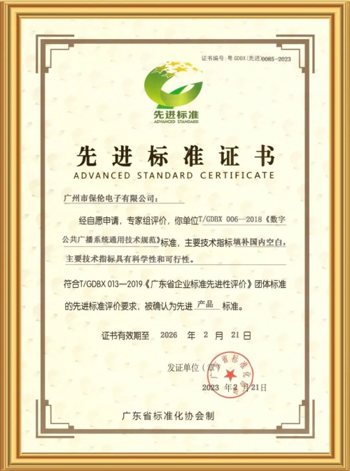 2月20日,經(jīng)廣東省標(biāo)準(zhǔn)化協(xié)會專家組評審決定,廣州市保倫電子有限公司(簡稱保倫電子itc)主導(dǎo)制定并實施的T/GDBX 006—2018《數(shù)字公共廣播系統(tǒng)通用技術(shù)規(guī)范》團體標(biāo)準(zhǔn)被評為廣東省先進標(biāo)準(zhǔn)。專家組確認該標(biāo)準(zhǔn)的“產(chǎn)品主要技術(shù)指標(biāo)填補國家標(biāo)準(zhǔn)、行業(yè)標(biāo)準(zhǔn)空白”。保倫電子itc是廣東省第二批獲得“先進標(biāo)準(zhǔn)證書”企業(yè)。