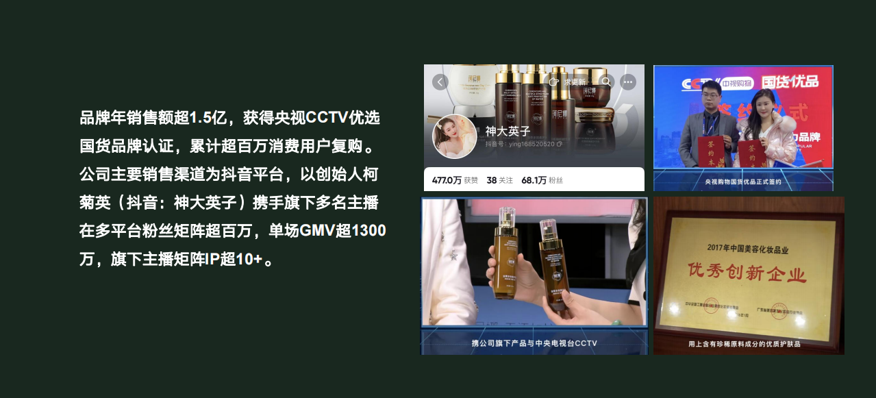 品牌年銷額超1.5億,獲CCTV優(yōu)選國貨品牌認證,累計超百萬消費用戶復購,公司主要銷售渠道為抖音平臺,以創(chuàng)始人柯菊英(抖音號:神大英子)攜手旗下多名主播,擁有超百萬的粉絲矩陣,其單場GMV超1500萬,旗下粉絲矩陣超10+。