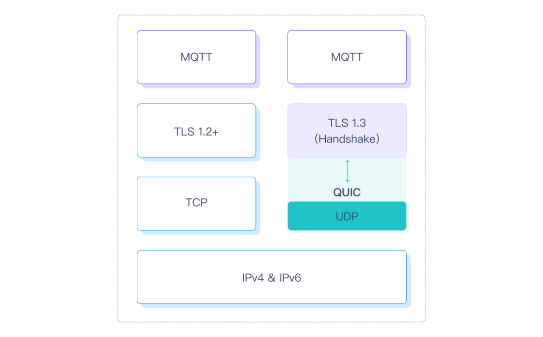 MQTT 5.0 定義了三種傳輸類型:TCP、TLS 和 WebSocket。在物聯(lián)網(wǎng)安全最 佳實踐中,MQTT over TLS/SSL 廣泛用于生產(chǎn)環(huán)境以保護客戶端和 Broker 之間的通信。然而它速度慢、延遲高,需要 3.5 個 RTT,即 TCP 3 次握手以及 TLS 4 次握手才能建立新的MQTT 連接。