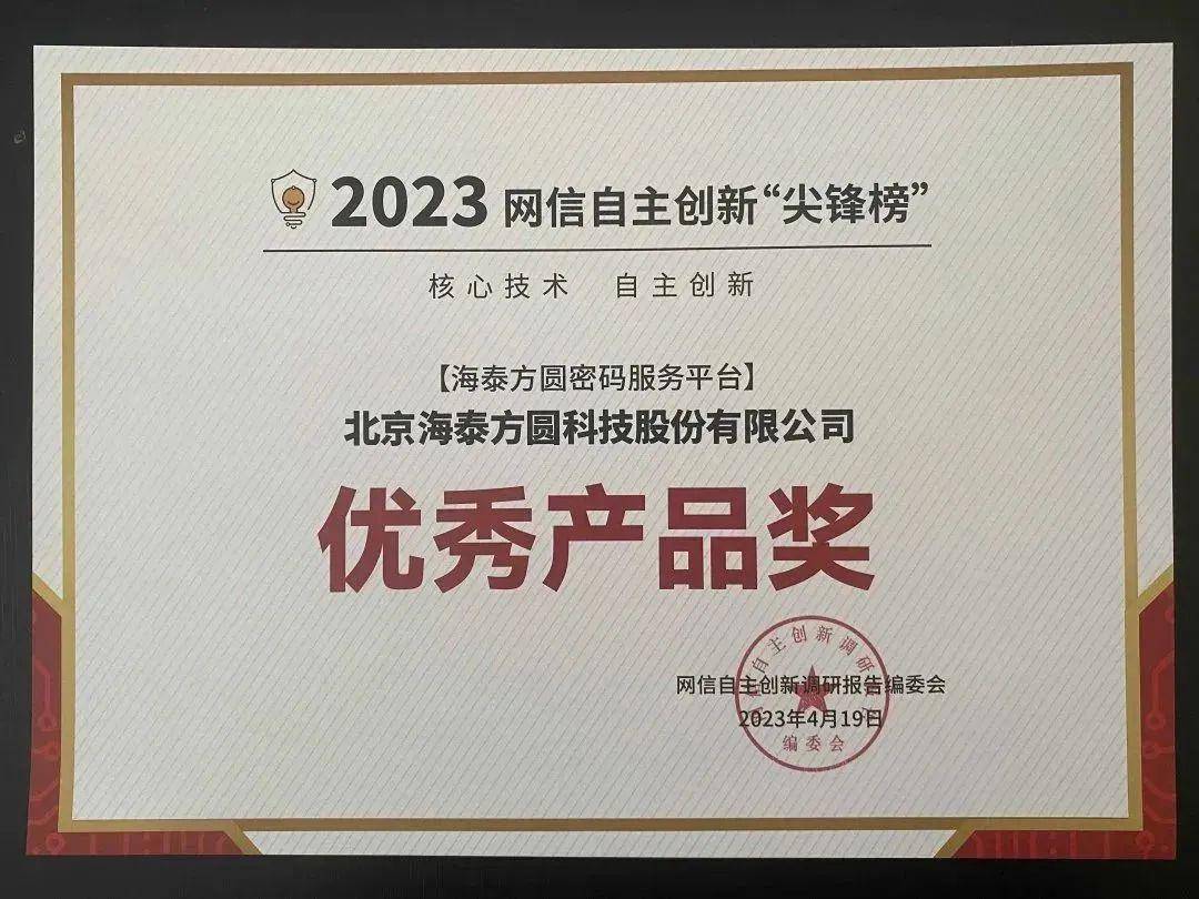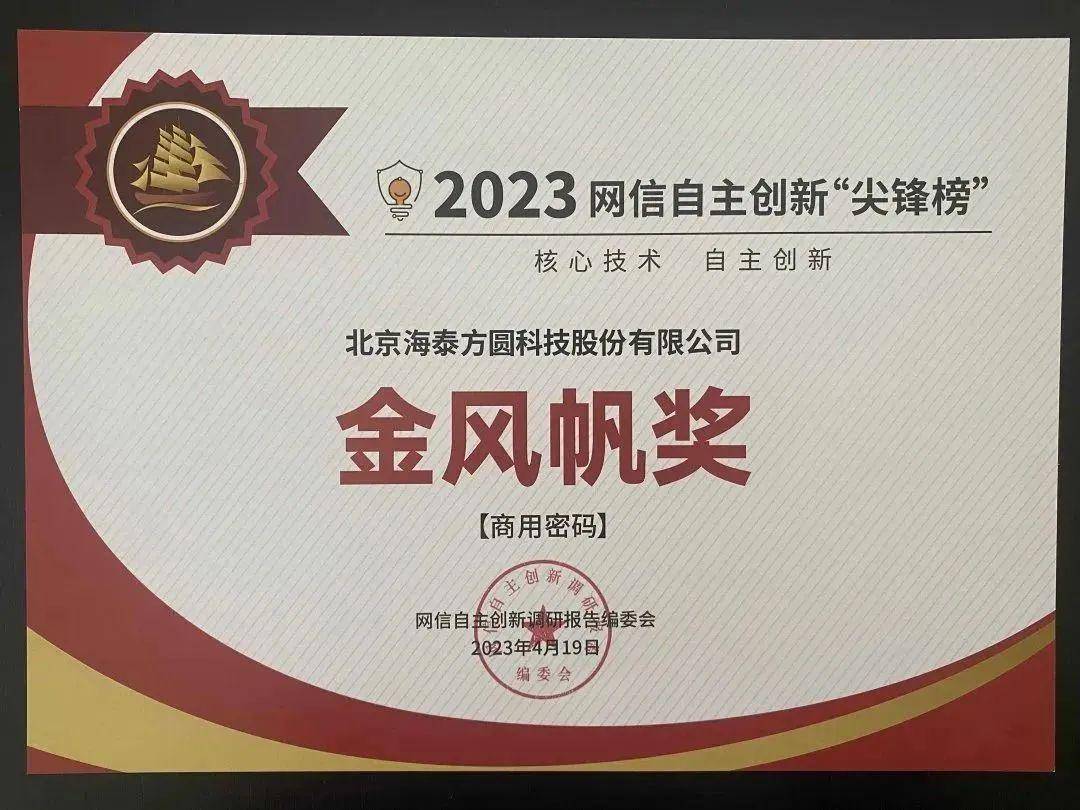 作為《報告》的積極貢獻者,海泰方圓受邀出席會議并榮登2023網信自主創(chuàng)新尖鋒榜,收獲四項榮譽:公司總裁姜海舟成功晉升專家委名單,并帶領企業(yè)在網信領域砥礪前行,榮獲金遠見獎;海泰方圓在網信自主創(chuàng)新的浪潮中乘風破浪,榮獲企業(yè)金風帆獎;海泰密碼服務平臺榮獲網信自主創(chuàng)新優(yōu)秀產品獎。