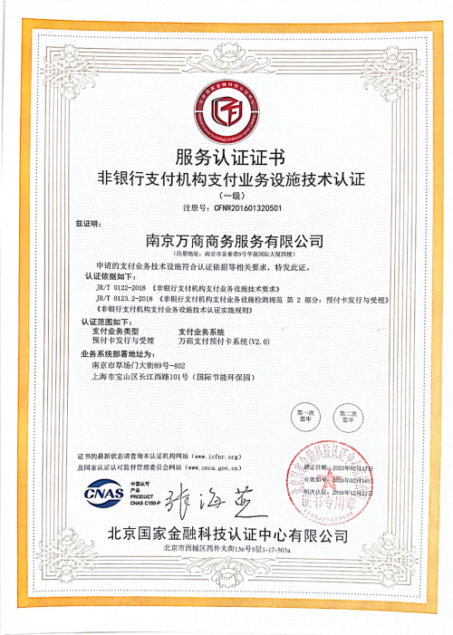 南京萬商正式獲得北京國(guó)家金融科技認(rèn)證中心有限公司(原中金國(guó)盛認(rèn)證中心)頒發(fā)的“非銀行支付機(jī)構(gòu)支付業(yè)務(wù)設(shè)施技術(shù)認(rèn)證”證書(證書編號(hào):CFNR201601320501)。