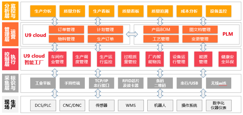 在制造執(zhí)行與控制層,用友自主研發(fā)的U9 cloud智能工廠系統(tǒng),全面覆蓋制造企業(yè)人機(jī)料法環(huán)測(cè)等核心業(yè)務(wù),包括:計(jì)劃管理、作業(yè)管理、品質(zhì)管理、物流管理、設(shè)備管理、工藝管理、人員管理和異常管理。
