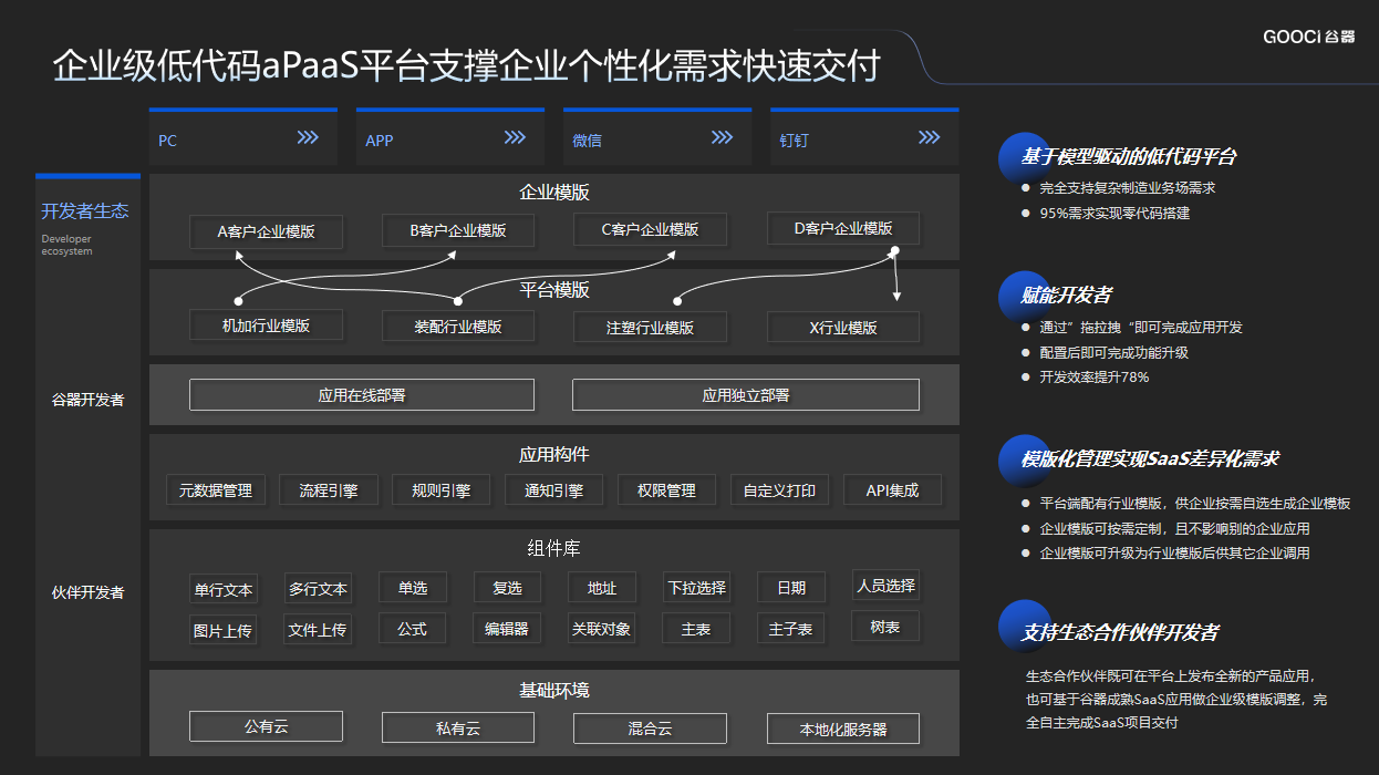 作為國內(nèi)第 一、通過SaaS+低代碼開發(fā)的企業(yè)數(shù)字化轉(zhuǎn)型解決方案服務(wù)商,谷器數(shù)據(jù)在促進低代碼開發(fā)平臺在制造領(lǐng)域規(guī)?;瘧?yīng)用的方向毅力前行,上線低代碼開發(fā)平臺,使得業(yè)務(wù)人員通過低代碼平臺配備頁面編輯器上的元素、樣式、組件自由編輯頁面,按需搭建個性化數(shù)字化應(yīng)用,滿足業(yè)務(wù)需求。另外,谷器低代碼開發(fā)平臺提供海量的行業(yè)組件庫,僅需通過組件配置的方式,在方便應(yīng)用開發(fā)的同時,構(gòu)建組件開發(fā)者生態(tài),持續(xù)豐富組件庫,保持應(yīng)用具備強擴展性、延續(xù)性,持續(xù)滿足企業(yè)數(shù)字化升級需求,并為行業(yè)提供成熟模板,加速產(chǎn)業(yè)數(shù)字化轉(zhuǎn)型步伐。