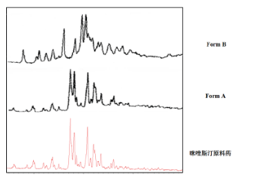 下圖為咪唑斯汀緩釋片中主藥成分為咪唑斯汀,其存在Form A、Form B兩種晶型,主藥在制劑中的占比為4.8%,輔料組成相對復(fù)雜且含有較高比例乳糖,會對晶型的XRPD表征存在干擾。因此,利用XRPD法直接對制劑中主藥的晶型進(jìn)行鑒定較難實(shí)現(xiàn),需要開發(fā)更加靈敏的實(shí)驗(yàn)手段。