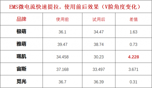 從以上數(shù)據(jù)可以看出,不同品牌美容儀的EMS微電流提拉效果不同,其中珮肌玉如意使用后的效果較為明顯,臉部輪廓可以瞬時(shí)提升4度。