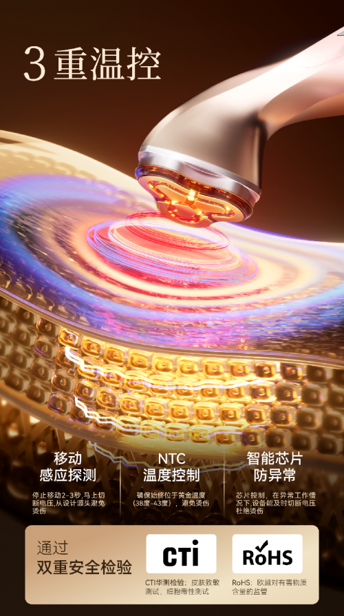 相比于其他美容儀的溫控系統(tǒng),玉如意美容儀還有三重安全保護(hù):移動(dòng)感應(yīng)探測(cè)功能、NTC溫度控制和芯片控制,確保美容儀時(shí)刻維持黃金溫度(38-43度),杜絕燙傷,讓用戶居家使用更安心。