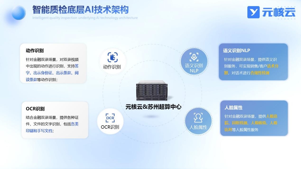 元核云依托AI技術打破人工質(zhì)檢桎梏,并與蘇州超算中心深度合作,結(jié)合金融業(yè)務場景進行深度訓練,提供了動作識別、語義識別、OCR識別和人臉屬性等AI服務,與音視頻技術高度融合,為金融視頻質(zhì)檢業(yè)務打造更智能、更便捷、更高效的解決方案。