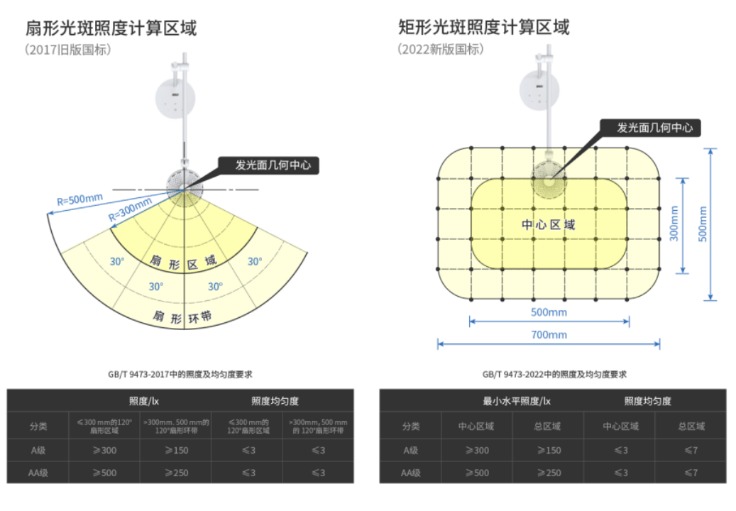 新版國標測算范圍不再“分區(qū)”,總區(qū)域包含中心區(qū)域,照度均勻度要求更高!