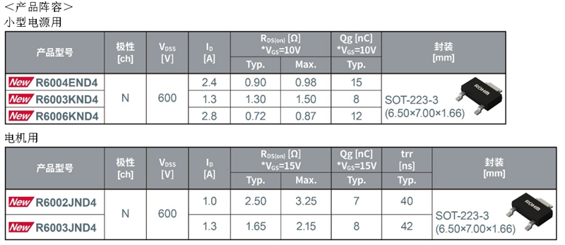 全球知名半導(dǎo)體制造商ROHM(總部位于日本京都市)開發(fā)出采用SOT-223-3小型封裝(6.50mm×7.00mm×1.66mm)的600V耐壓Super Junction MOSFET*1“R6004END4 / R6003KND4 / R6006KND4 / R6002JND4 / R6003JND4”,新產(chǎn)品非常適用于照明用小型電源、電泵和電機(jī)等應(yīng)用。