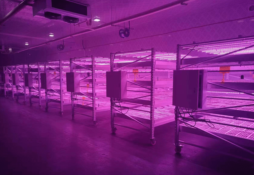 在項(xiàng)目現(xiàn)場(chǎng),約300平米的封閉式室內(nèi)空間里,布置了25套三思可變光譜立體育苗系統(tǒng)Vertical X及配套的溫控設(shè)備、加濕設(shè)備、水肥一體化設(shè)備、通風(fēng)設(shè)備及相關(guān)的傳感器、控制終端等,組成了一套小型全人工氣候型育苗植物工廠。