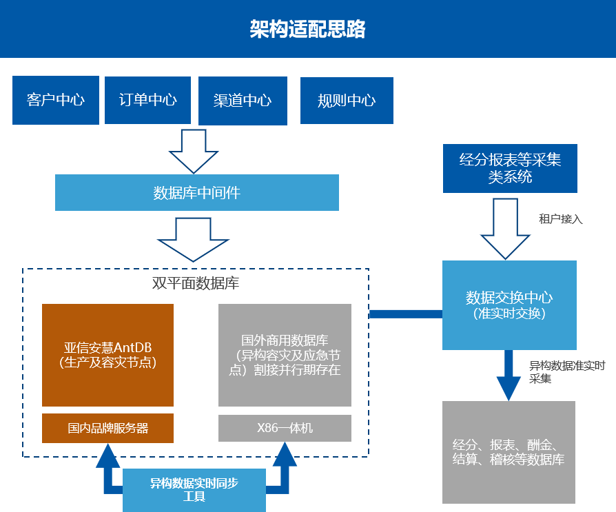 架構(gòu)適配將應用系統(tǒng)和數(shù)據(jù)庫之間、庫和庫之間多樣化的交互方式收斂到統(tǒng)一的數(shù)據(jù)庫中間件、數(shù)據(jù)庫交換中心及實時同步工具三大組件,減少后續(xù)換庫改造成本;