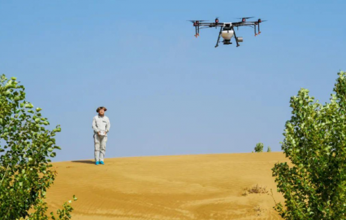 傳統(tǒng)的種樹方式是人們在沙地上挖大坑,然后將苗木栽入其中。然而,這種方式人工成本高,并且容易破壞土壤生態(tài)。在沙漠治理的漫長歷程中,億利資源集團不斷探索著更高效、更環(huán)保的方法。隨著科技的飛速發(fā)展,億利資源集團引入了無人機飛播技術,為這一領域帶來了革命性的變化。這種先進的技術利用無人機將植物種子精準播撒在需要綠化的區(qū)域,顯著提高了種植效率,為沙漠治理開辟了新的道路。