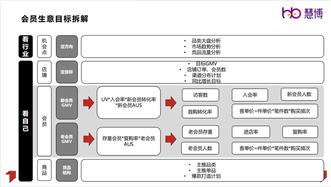 品牌可以根據(jù)品類大盤分析、市場(chǎng)趨勢(shì)分析、競(jìng)品流量分析等作為定方向的依據(jù),更貼合實(shí)際。目標(biāo)則根據(jù)自己店鋪的GMV、會(huì)員數(shù)/GMV增長(zhǎng)等作為參考。