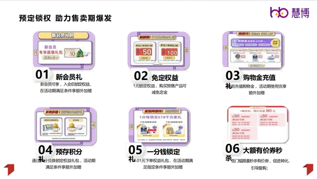 通過預(yù)定鎖權(quán)策略,商家可以提前鎖定一部分消費(fèi)者,確保銷售的穩(wěn)定;在大促預(yù)售期,品牌可以提前通過新會(huì)員禮、免定權(quán)益、一分錢鎖定等營(yíng)銷策略進(jìn)行用戶權(quán)益鎖定。在保證穩(wěn)固部分流量的同時(shí),有效提升用戶的入會(huì)率。