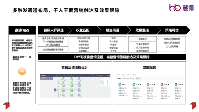 為了高效解決該問題,慧博科技基于多渠道資源整合能力,幫助品牌整合各類可觸達(dá)消費(fèi)者的渠道資源;并通過多波段流程設(shè)計(jì)以及活動(dòng)設(shè)計(jì)能力,幫助品牌根據(jù)消費(fèi)者的不同需求和階段,設(shè)計(jì)出一系列有針對(duì)性的活動(dòng),滿足千人千面的消費(fèi)者營(yíng)銷需求。