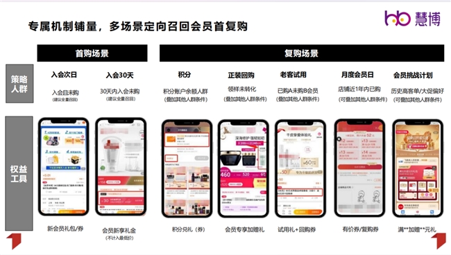 1、專屬機(jī)制鋪量,多場(chǎng)景定向召回會(huì)員首復(fù)購