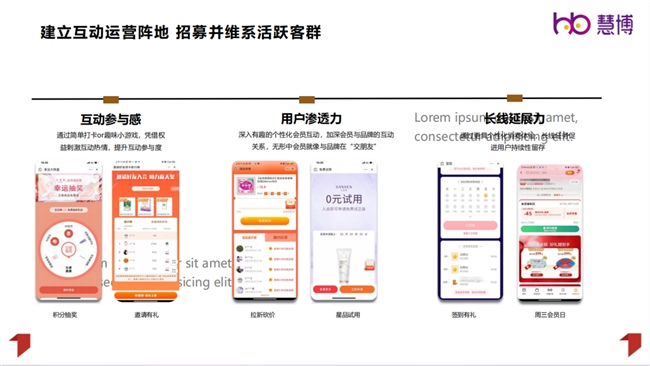 慧博科技提供了豐富的互動(dòng)營(yíng)銷玩法模板和創(chuàng)意建議,比如,通過積分抽獎(jiǎng)、邀請(qǐng)有禮等簡(jiǎn)單的或趣味性的小游戲,有效提升用戶的互動(dòng)參與感;通過拉新砍價(jià)、新品試用等互動(dòng)玩法有助手加深會(huì)員與品牌的互動(dòng),提升會(huì)員體驗(yàn);簽到有禮、周三會(huì)員日,則利于提升會(huì)員留存。
