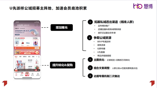 以天貓平臺(tái)為例,商家可以有效利用”U先派樣“的公域資源來作為公域招募主陣地,通過在該模塊拓展更多品牌會(huì)員權(quán)益來吸引消費(fèi)者關(guān)注品牌,增加曝光;通過基于目標(biāo)人群特性優(yōu)化的主圖+文案,二次刺激消費(fèi)者下單消費(fèi),在消費(fèi)的鏈路中引導(dǎo)入會(huì)并沉淀到私域會(huì)員池中。