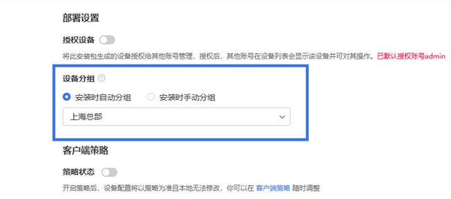 “手動分組”則是將分組這一具體操作下放,自助式地完成分組:當定制安裝包進行安裝部署時,可以手動選擇自己設(shè)備所在的分組,這一過程不再需要管理員在后臺操作。這樣一來,后臺不再需要為不同的組別定制不同的安裝包,大大降低所需定制包的數(shù)量,IT管理員只需要在員工偶爾出現(xiàn)分組選擇錯誤的時候,在后臺進行調(diào)整即可。