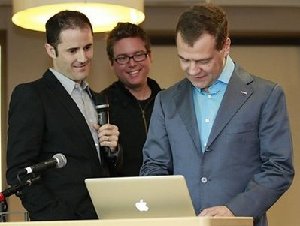 梅德韋杰夫(右一)在兩位Twitter聯(lián)合創(chuàng)始人的幫助下開通Twitter賬戶