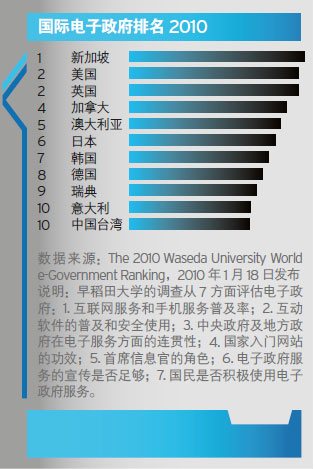 在絕大多數(shù)國(guó)家,政府都被毫無(wú)例外地分割成多個(gè)部門(mén),如何整合,新加坡樹(shù)立了一個(gè)經(jīng)典范例。在近兩年間眾多關(guān)于電子政府的排名中,新加坡都表現(xiàn)不俗。在日本早稻田大學(xué)“國(guó)際電子政府排名”中,2009年和2010年都名列第一,在美國(guó)布朗大學(xué)“2007電子政府報(bào)告”中排名第二。在新加坡政府所實(shí)施的“從傳統(tǒng)城市國(guó)家發(fā)展為智慧國(guó)”的戰(zhàn)略中,電子政府占據(jù)核心的一環(huán)。新加坡的電子政府發(fā)展可以追溯到上世紀(jì)80年代初,那時(shí)候電腦剛剛開(kāi)始應(yīng)用,新加坡的第一個(gè)國(guó)家計(jì)算機(jī)化計(jì)劃就是把政府辦公電腦化,經(jīng)過(guò)隨后的兩個(gè)規(guī)劃,新加坡又完成了政府服務(wù)向互聯(lián)網(wǎng)上的轉(zhuǎn)移和優(yōu)化。而現(xiàn)在,新加坡正在實(shí)行的是2006年推出的第四個(gè)規(guī)劃——整合政府。
