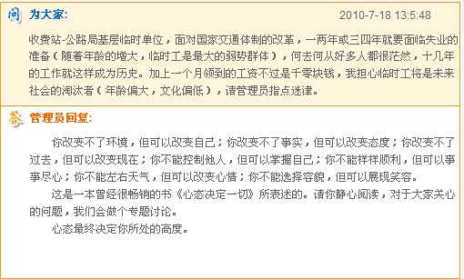 有這樣一條就讓人感觸頗深,網(wǎng)友“為大家”問道:收費站是公路局基層臨時單位,面對國家交通體制的改革,一兩年或三四年就要面臨失業(yè)的準(zhǔn)備,何去何從好多人都很茫然,請管理員指點迷津。管理員的回答說“你改變不了環(huán)境,但可以改變自己;你改變不了事實,但可以改變態(tài)度,心態(tài)最終決定你所處的高度?!?/p>