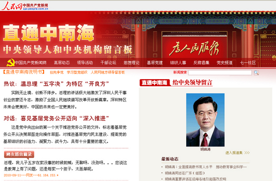 記者從人民網(wǎng)獲悉,人民網(wǎng)、中國(guó)共產(chǎn)黨新聞網(wǎng)近日(9月8日)正式推出“直通中南海——中央領(lǐng)導(dǎo)人和中央機(jī)構(gòu)留言板”欄目。網(wǎng)友可以在該欄目上給胡錦濤、溫家寶等中央領(lǐng)導(dǎo)人留言。