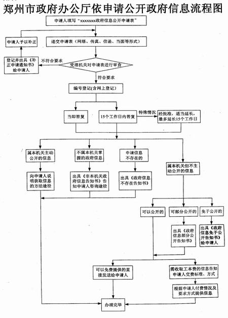屬主動公開范圍的市政府信息,市政府將自該信息形成或變更之日起20個工作日內(nèi)公開。鄭州市政府還專門制作了《依申請公開政府信息流程圖》,要求其他單位照此執(zhí)行。