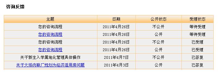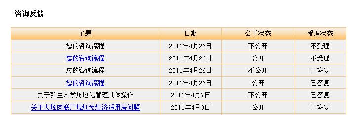 3.網(wǎng)站管理員看到您處于“等待受理”的信息后,會進(jìn)行閱讀處理。視咨詢的內(nèi)容,一般為當(dāng)天或最長至3個工作日內(nèi)進(jìn)行答復(fù)。對于您的咨詢,主要有4種狀態(tài),如下圖。